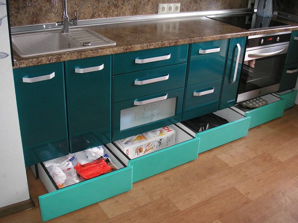 Кроме ящиков, места, к которым затруднен доступ, можно задействовать и по-другому. К примеру, можно обустроить нижний отдел гарнитура, пространство у напольного покрытия. Рамы на колесиках, декорированные красивой панелью, позволяют превратить место под мебелью в полезное пространство для размещения банок с соленьями.