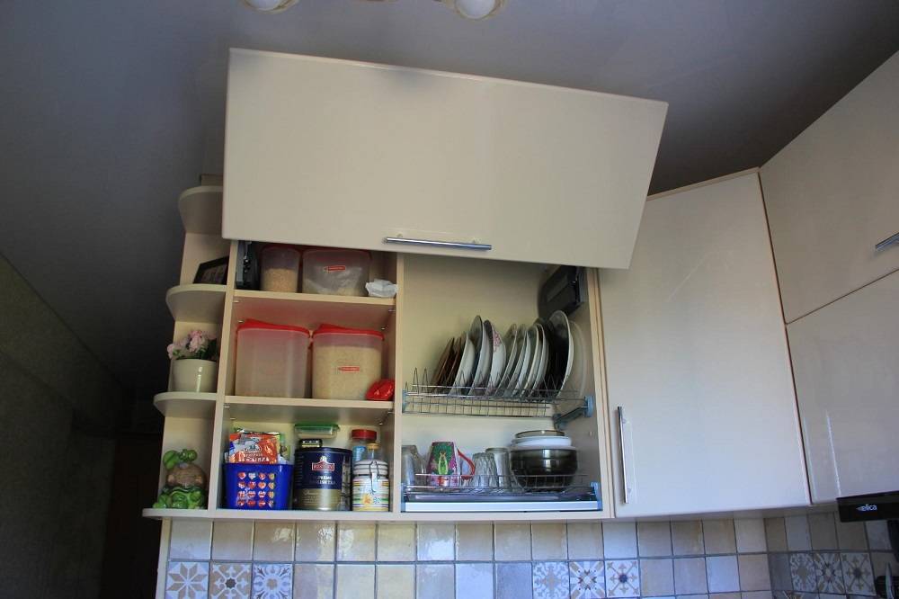 Один из шкафов на кухне хозяйки заполняют тарелками и кружками. В него ставят сушилку — решетку из металла или пластика. Под ней располагают поддон, в который стекает вода.