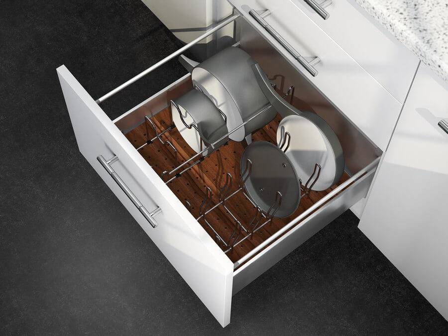 Высокий и глубокий ящик легко разделить на 3 части, в которых поместятся крышки и вся металлическая посуда.
