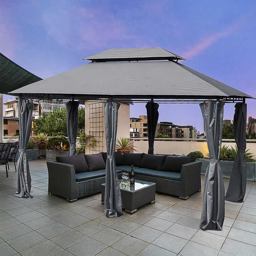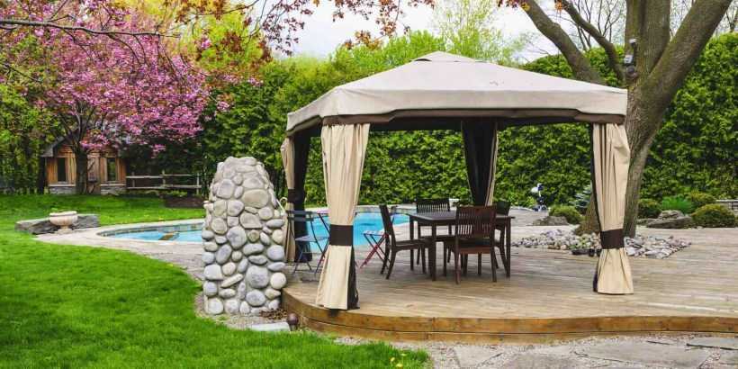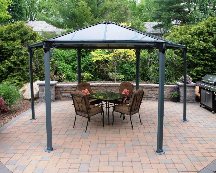 Мы уже говорили, что, например, для полноразмерного квадратного павильона изготовить навес как минимум дорого. Гораздо дешевле установить на ней садовый зонт. Он и от солнца защитит, и смотреться будет отлично, и за кредитом вас в банк не отправит.