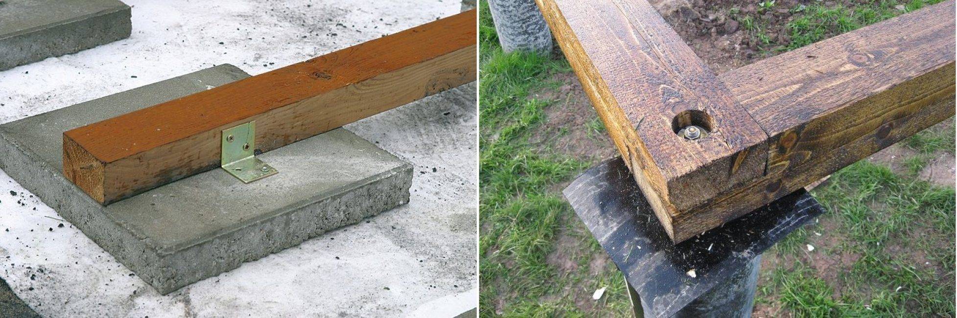 - Уложите на настил брусья нижней обвязки, соедините их между собой при помощи металлических уголков и прикрепите к основанию.