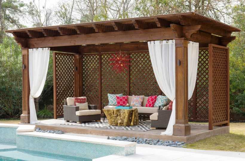Иногда терраса возводится несколько поодаль. Здесь она больше напоминает беседку, но отличается от нее основательностью конструкции. Часто подобные строения возводят возле бассейна, или они становятся частью зоны отдыха.