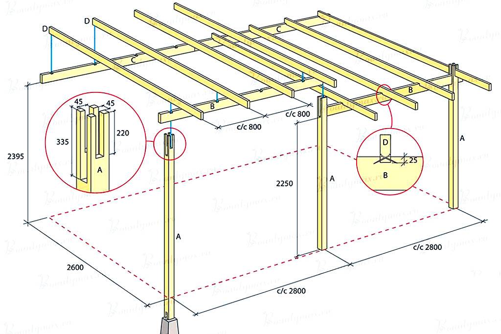 Если изготавливается конструкция отдельная от дачного домика, потребуется сделать навес не менее, чем с четырьмя опорами.