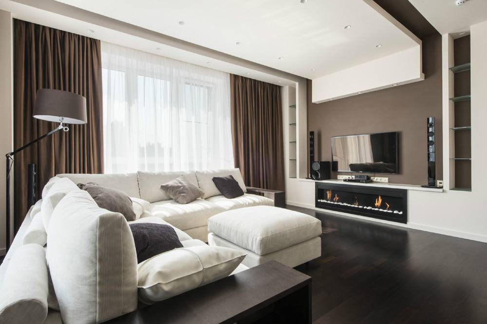 Гостиная минималистического стиля представляет собой «светлое пространство» с минимальным количеством мебели. Окна, не загроможденные тяжелыми портьерами, а оснащенные римскими шторами или жалюзи, пропускают солнечный свет, освещая комнату.