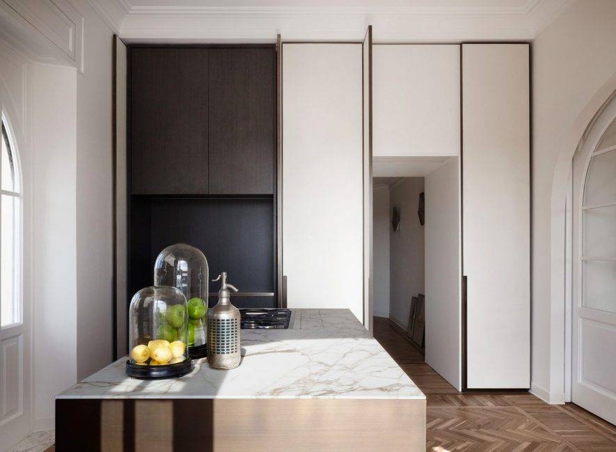 Аппаратура и предметы бытового назначения прячутся за фасадными панелями встроенной мебели.