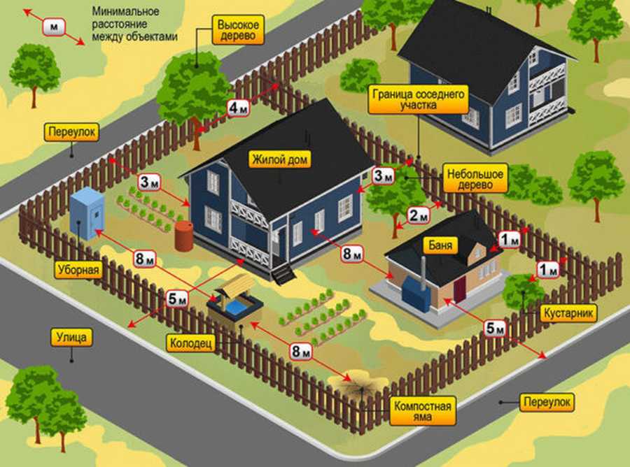 Для небольших деревьев — 2 метра. Дистанция от кустарника до забора — 1 м. Расстояние от колодца до компостной ямы не будет ниже 8 метров. Строить дома по нормам лучше доверять технически грамотным специалистам.