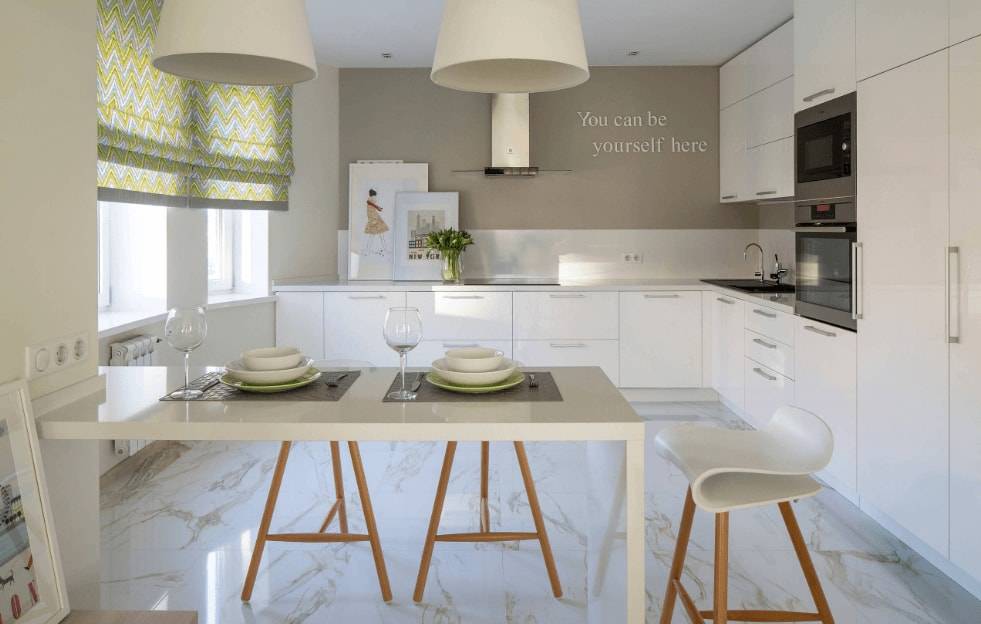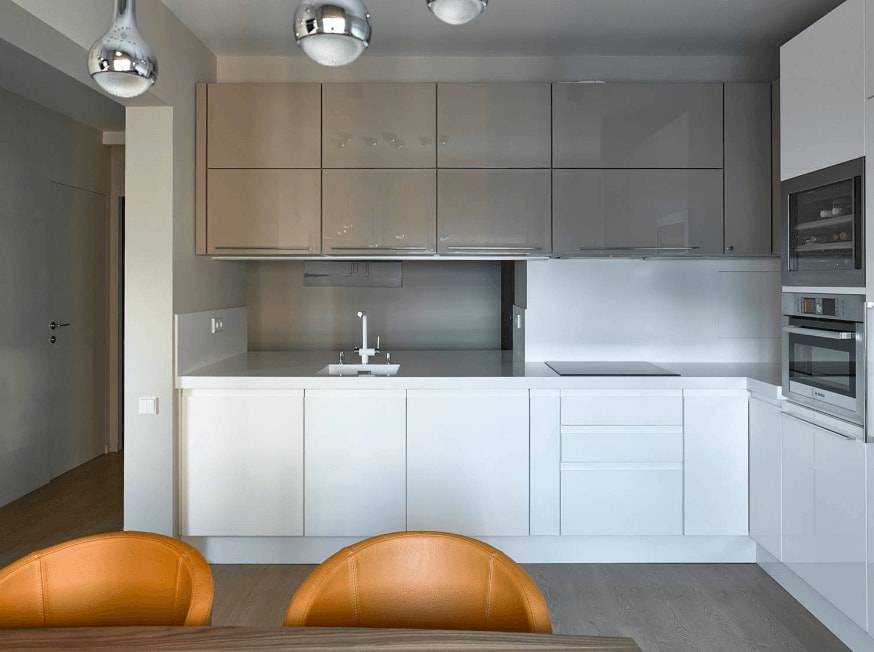 Идеальный цвет для маленького помещения — белый. Однако весь интерьер в нем не создашь – кухня не хирургическая операционная. Самым расширяющим пространство станет сочетание белого и жемчужно-серого. Такой тандем и смотреться будет очень стильно, дорого и со вкусом.