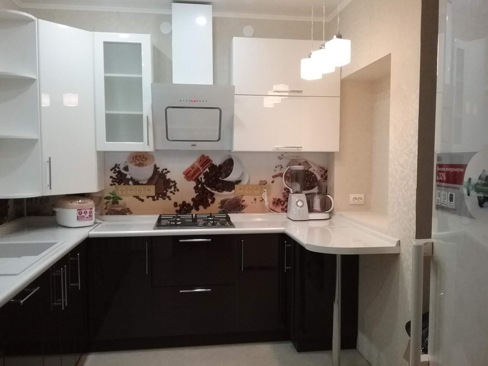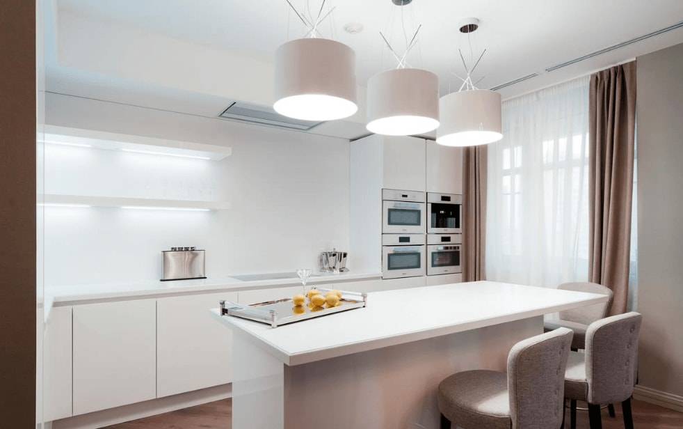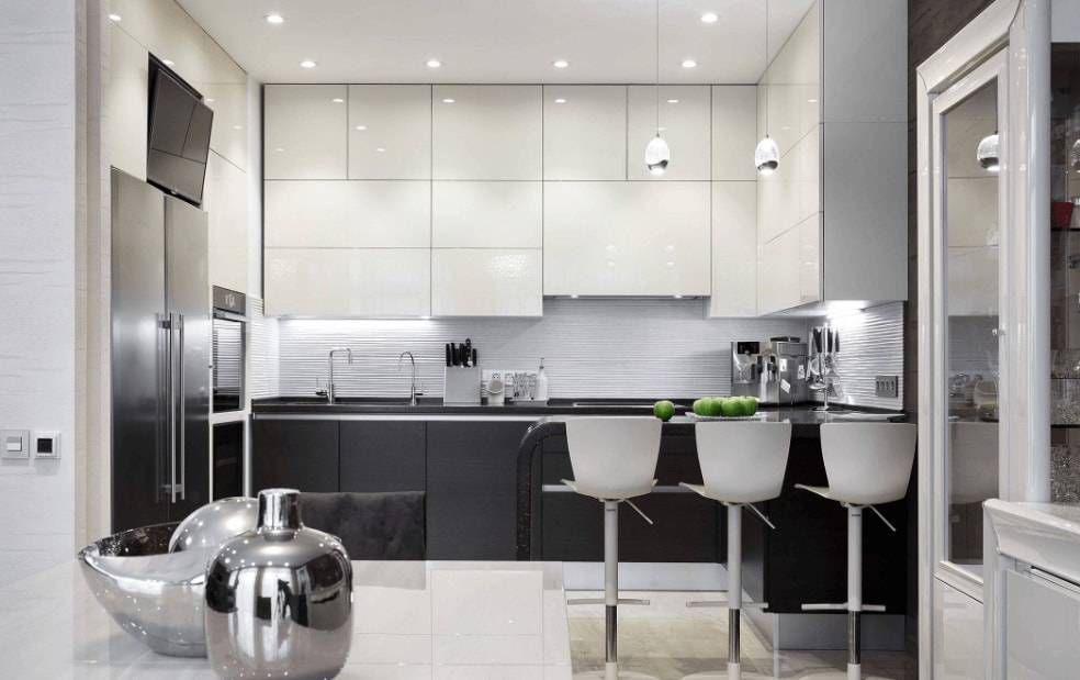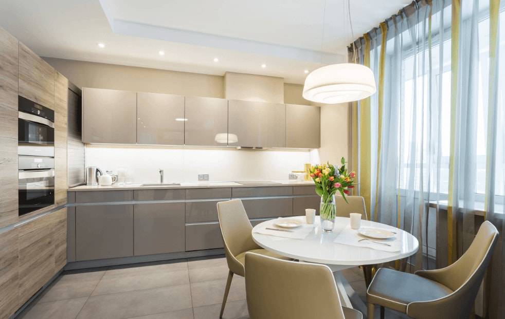 Также для визуальной коррекции пространства подходят зеркальные и глянцевые поверхности. Отличным решением в такой ситуации будут панорамные окна, за счет чего на кухне всегда будет больше света. Ну и конечно же, не стоит забывать об искусственном освещении. С его помощью можно выгодно расставить акценты и подсветить рабочую поверхность.