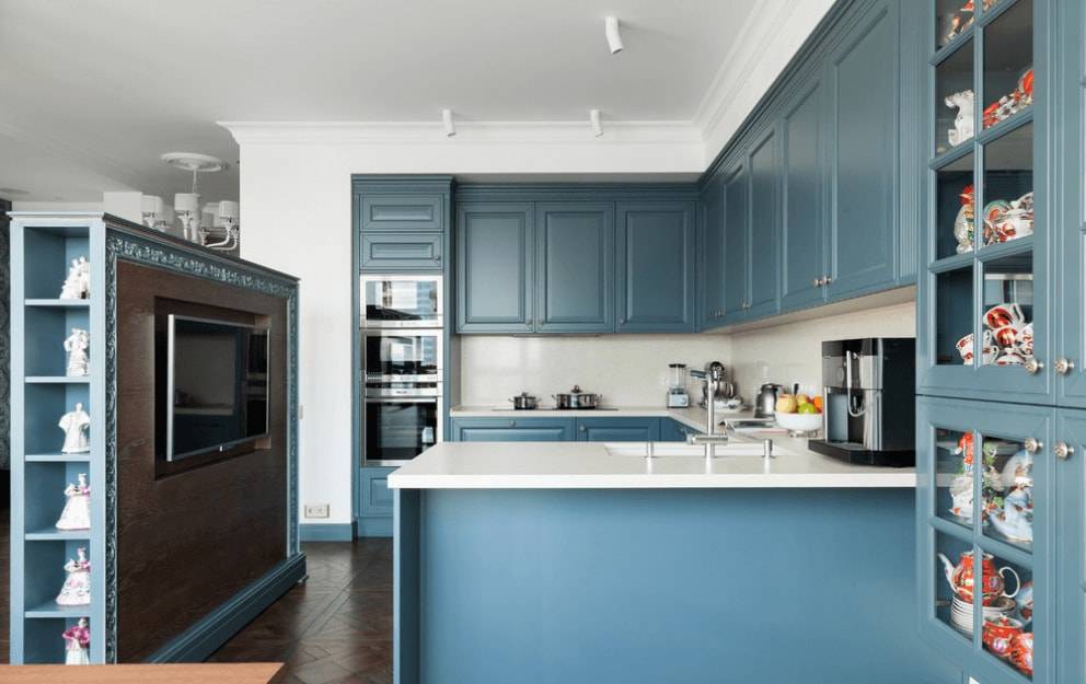 Также прекрасно подойдут бежевые разных оттенков, в том числе и более темные. Использование синего идеально подходит для небольшой кухни, можно рассмотреть двухцветную кухню – синие нижние шкафы и белые верхние шкафы. Выбор за вами.