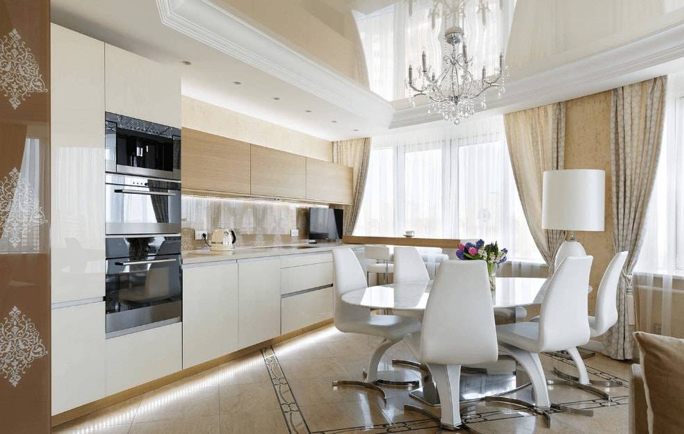 Также для визуальной коррекции пространства подходят зеркальные и глянцевые поверхности. Отличным решением в такой ситуации будут панорамные окна, за счет чего на кухне всегда будет больше света. Ну и конечно же, не стоит забывать об искусственном освещении. С его помощью можно выгодно расставить акценты и подсветить рабочую поверхность.
