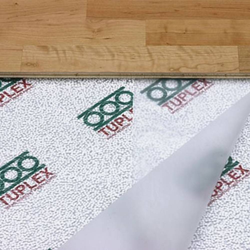 Комбинированные подложки. Яркий пример – серия Tuplex. Это эластичный рулонный продукт из двух слоев плотного полиэтилена, внутри которого содержатся шарики пенопласта, толщина — 3 мм. Обеспечивает неплохую гидроизоляцию ламината и паркетной доски, но со временем проседает под нагрузкой. Стоимость – от 60 р./м².