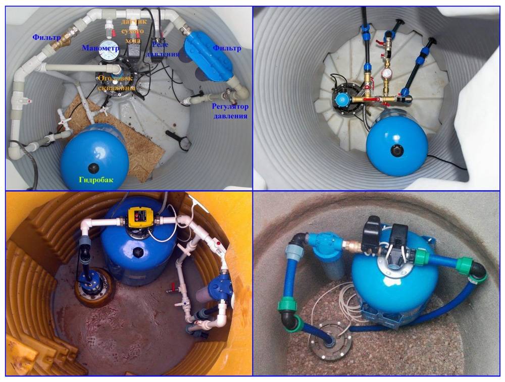 Если обсадная колонна скважины спрятана в кессоне, то возможны два варианта размещения оборудования. При первом всю автоматику, как и при адаптерном подключении, размещают в доме. При втором варианте используют свободное пространство внутри кессонного колодца. В нем размещают фильтры, реле давления и сухого хода, гидроаккумулятор.