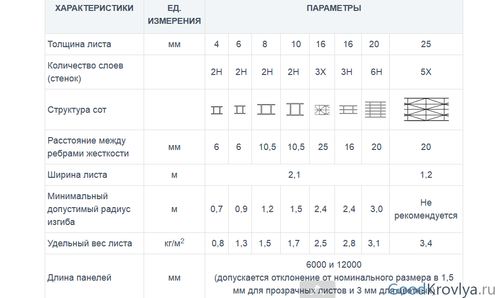 Сотовый поликарбонат — это полимерный материал, изготовляемый в виде листов, которые имеют полую ячеистую структуру. Изделие имеет два слоя, соединенных ребрами жесткости в виде сот. Они могут быть от 4 до 25 мм. Чем больше объем, тем меньше его теплопроводность.