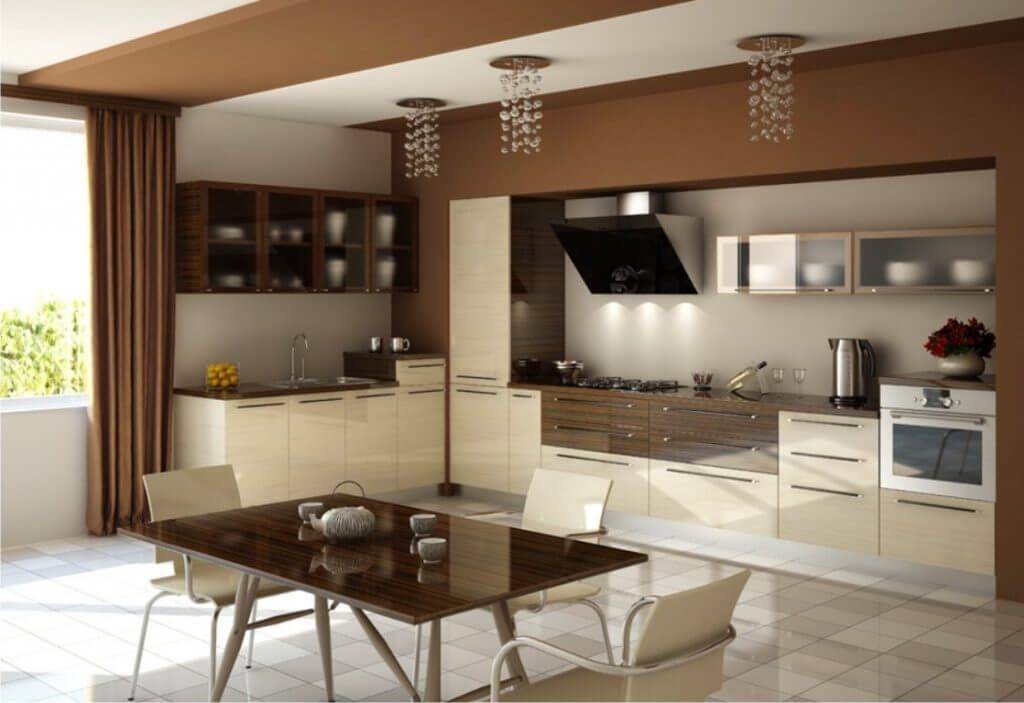 Если высота комнаты без отделки не превышает 2,5 метров, то более разумным решением станет выбор ровной поверхности. В этом случае вы можете использовать разные цвета для выделения зон. Но воздержитесь от слишком насыщенных тонов, если кухня небольшая и недостаточно освещенная.