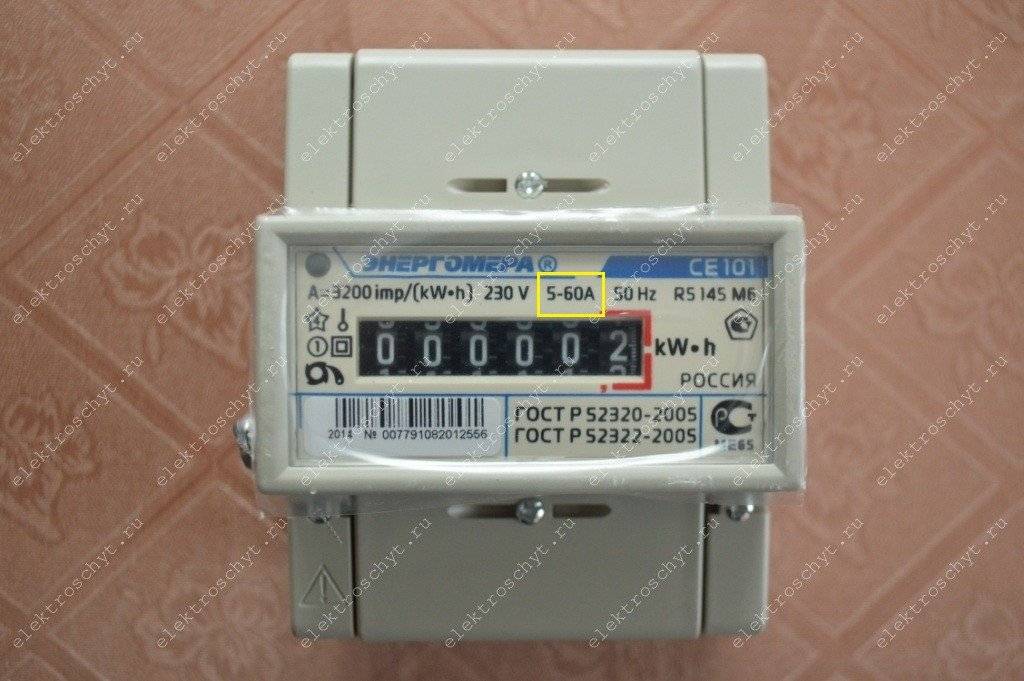 Мы уже определились однофазный или трехфазный электросчетчик для квартиры, дома нам нужен, далее необходимо выбрать электросчетчик по максимальному току, т.е. по нашей максимальной нагрузке(сумме мощностей всех электроприборов, в этом, безусловно, нам в первую очередь поможет проект электроснабжения, где на однолинейной схеме на вводном автомате будет указан его максимальный ток. Если вы просто меняете старый электросчетчик для квартиры, дома на новый, то достаточно посмотреть максимальный ток на самом автомате в электрощите, либо на панели старого электросчетчика, и выбрать электросчетчик для квартиры, дома с током выше, чем у автомата, т.е. если у вас вводной автомат рассчитан на 32 А, то электросчетчик необходимо выбрать не ниже 40 А. В качестве примера, на фото показан электросчетчик для квартиры, через который не должно “протекать” более 60А.