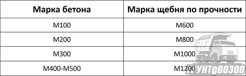 Обратите внимание на таблицу, представленную ниже. Соответствие марок щебня и бетона