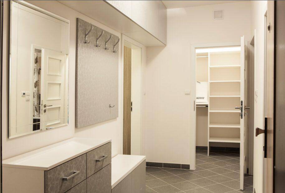 В прихожей также должен быть большой шкаф — обычный или купе. Наиболее востребованы двух- и трехстворчатые, однако в некоторых моделях может быть предусмотрено 6 и более дверей. В таких конструкциях хранится не только повседневная одежда, но и те вещи, которые используются время от времени.