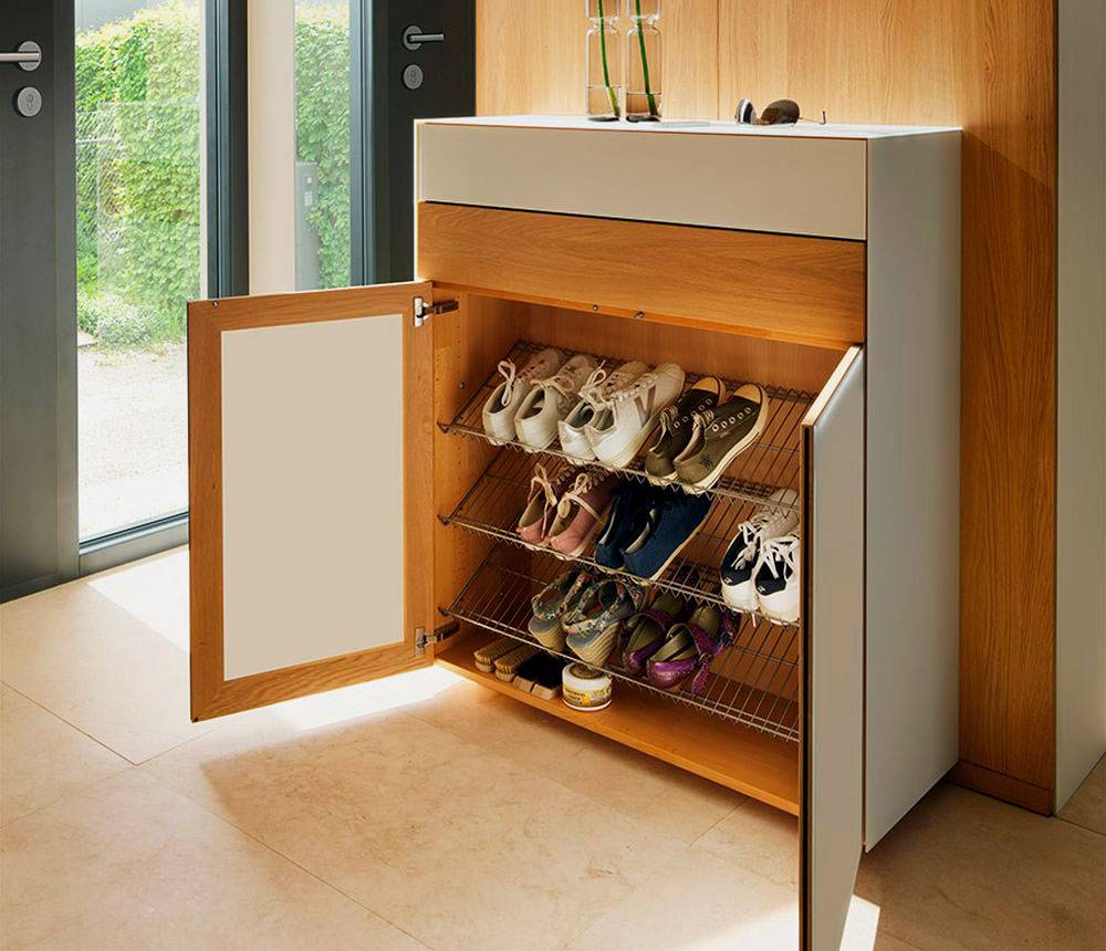 Должно быть организовано место для хранения обуви. Оборудовать его в том же шкафу нерационально, лучше использовать отдельный встроенный или независимый элемент. Это может быть еще один комод или обычная полка. В некоторых моделях предусмотрена лавка. Более практичны изделия с ящиками, предназначенные для хранения средств по уходу за обувью.