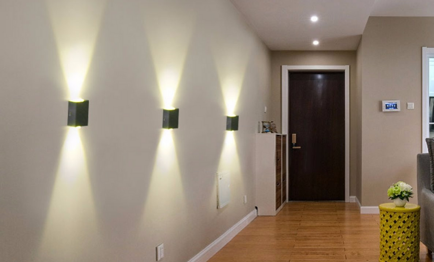 Удобны рамповые панели, их монтируют в верхней части стены. Плафоны можно направлять в разные стороны, удобно скрывать дефекты отделки, моделировать геометрию прихожей.