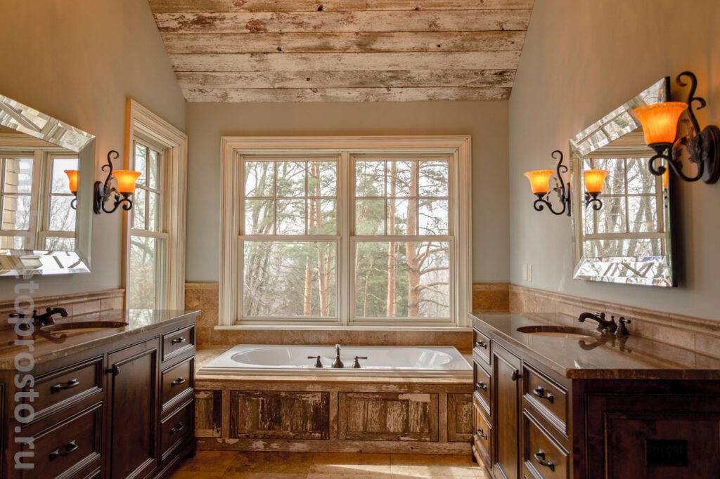Ванные комнаты с большой площадью, как правило, оборудуются в загородных домах и имеют одно или несколько окон. Такие помещения быстро избавляются от лишней влаги, благодаря естественной вентиляции и большому количеству солнечного света.
