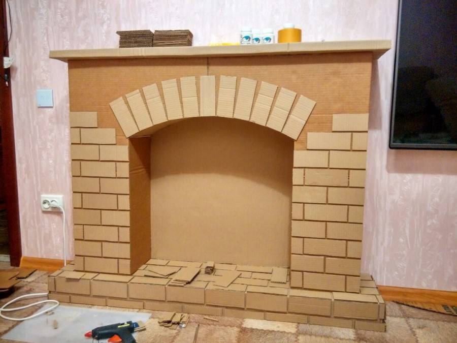 Основой каминной конструкции будет картонный каркас. Для его сооружения лучше всего использовать плотные картонные коробки. Гофрированный картон для упаковки крупных бытовых изделий будет самым подходящим. Если сохранилась упаковка от телевизора, то идеальный каркас уже готов.