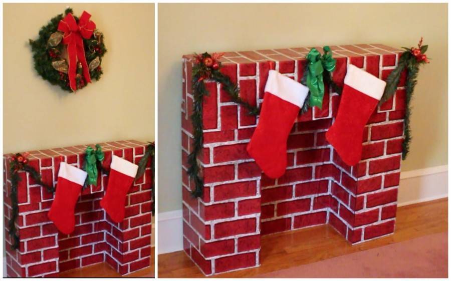Мало просто сделать своими руками фальш-камин из картона. Если подойти к этому процессу без фантазии, получится просто короб с прорезанным в нем полукруглым отверстием. Поделку нужно декорировать, придать ей праздничный вид.