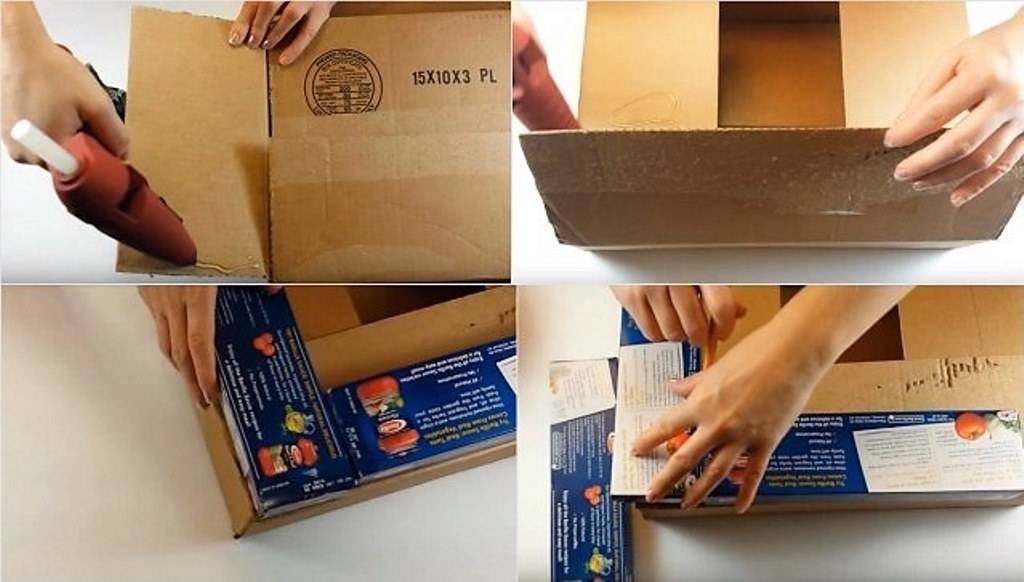 Важно, чтобы коробка была устойчивой, поэтому в углах необходимо выполнить небольшие надрезы острым канцелярским ножом. В тех местах, где конструкция соединяется между собой, картон надо склеить