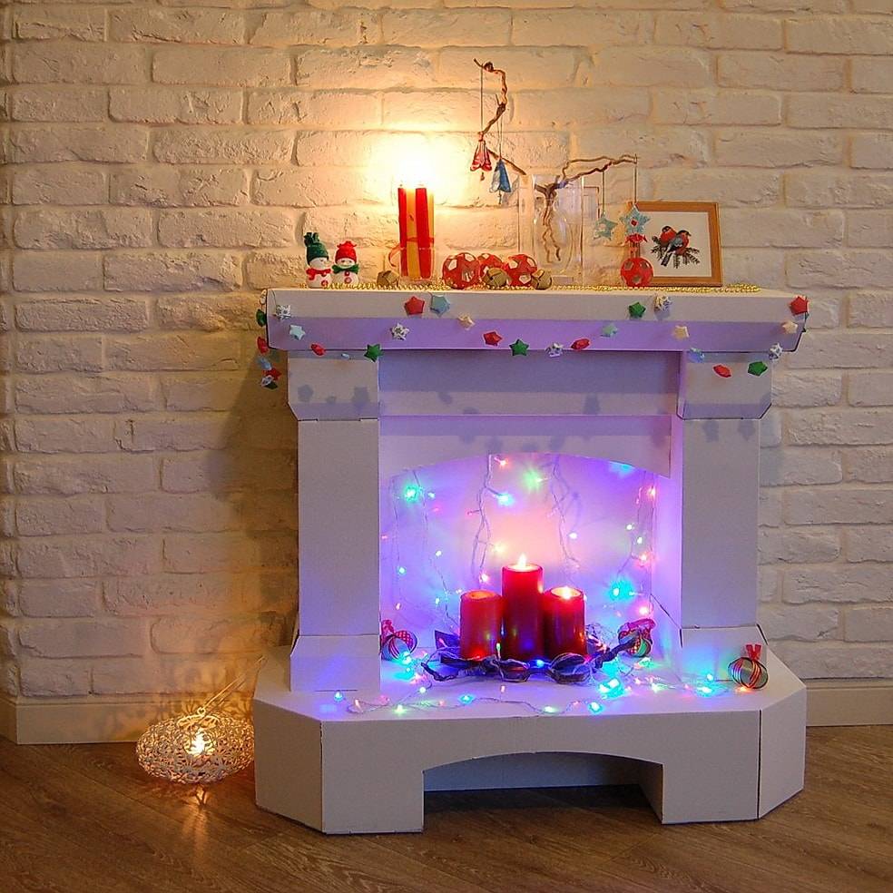 Опускаем гирлянду, добавляем дополнительный декор и устанавливаем камин в подходящее место.