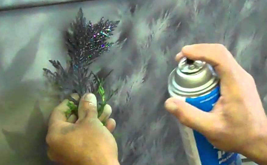 - При использовании предметов природы (листьев, веток, травы), их нужно прислонять к поверхности и распылять краску поверх. Лучше собрать разнообразные экземпляры. Удобнее будет использовать более плоские листья, чтобы они хорошо ложились на поверхность. Можно распылять краску только на их края. Так контур листьев и веток отпечатается на поверхности. После высыхания краски, процесс нужно повторить, используя краски других цветов и прислоняя другие листья, располагая их по-другому. Также можно перекрывать уже прокрашенные листья последующими.