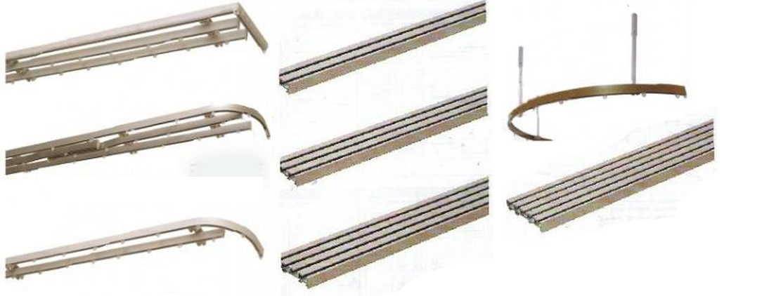 Одна из самых интересных и разнообразных групп. Рельсовые карнизы для штор могут быть сделаны из металла или пластика. Пластиковые при хорошем качестве неплохо себя ведут в эксплуатации, но подходят только для легких тканей.