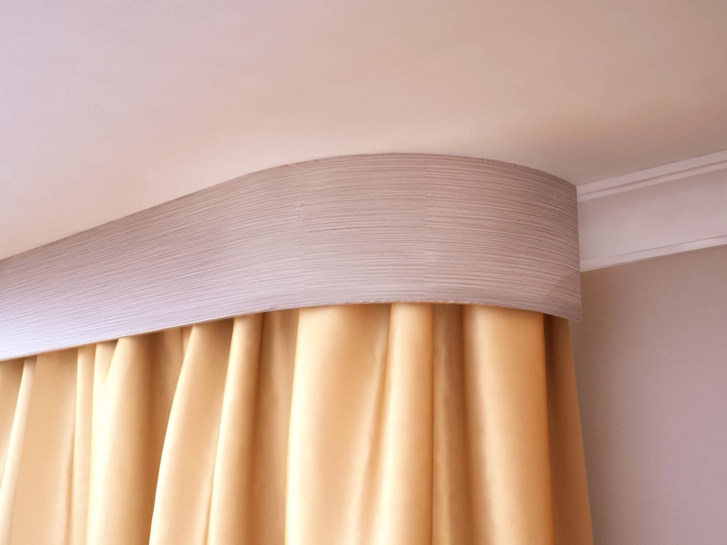 - Потолочные конструкции, фиксирующиеся непосредственно на потолку перед оконным проемом. Это наиболее распространенное решение ввиду своих эстетических качеств — подобранные в цвет потолка направляющие незаметны визуально, они не нарушают общую картину декора окна, что позволяет реализовывать любые дизайнерские идеи;