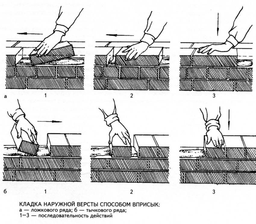 - Вприсык. Указанный метод актуален при работе с пластичным составом. Кирпич при этом слегка наклоняют, задевают одной его гранью уложенный раствор, продвигают его к зафиксированной до этого детали и осаживают.