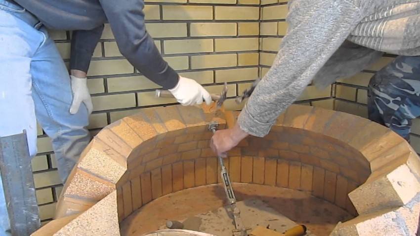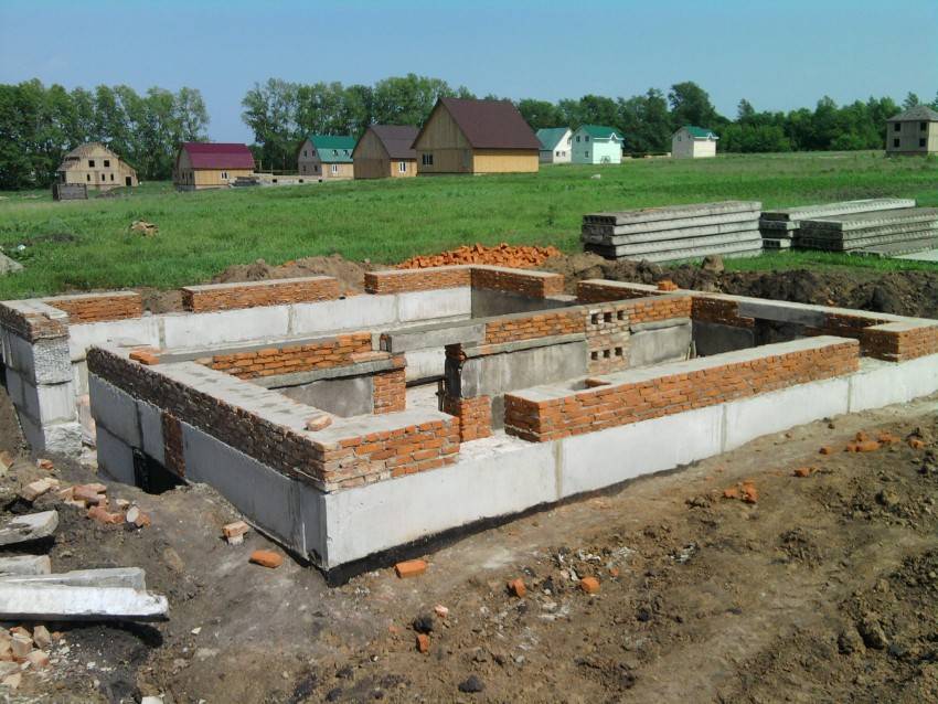 Сначала выгоняют два угла, потом их связывают несколькими рядами кирпичной кладки