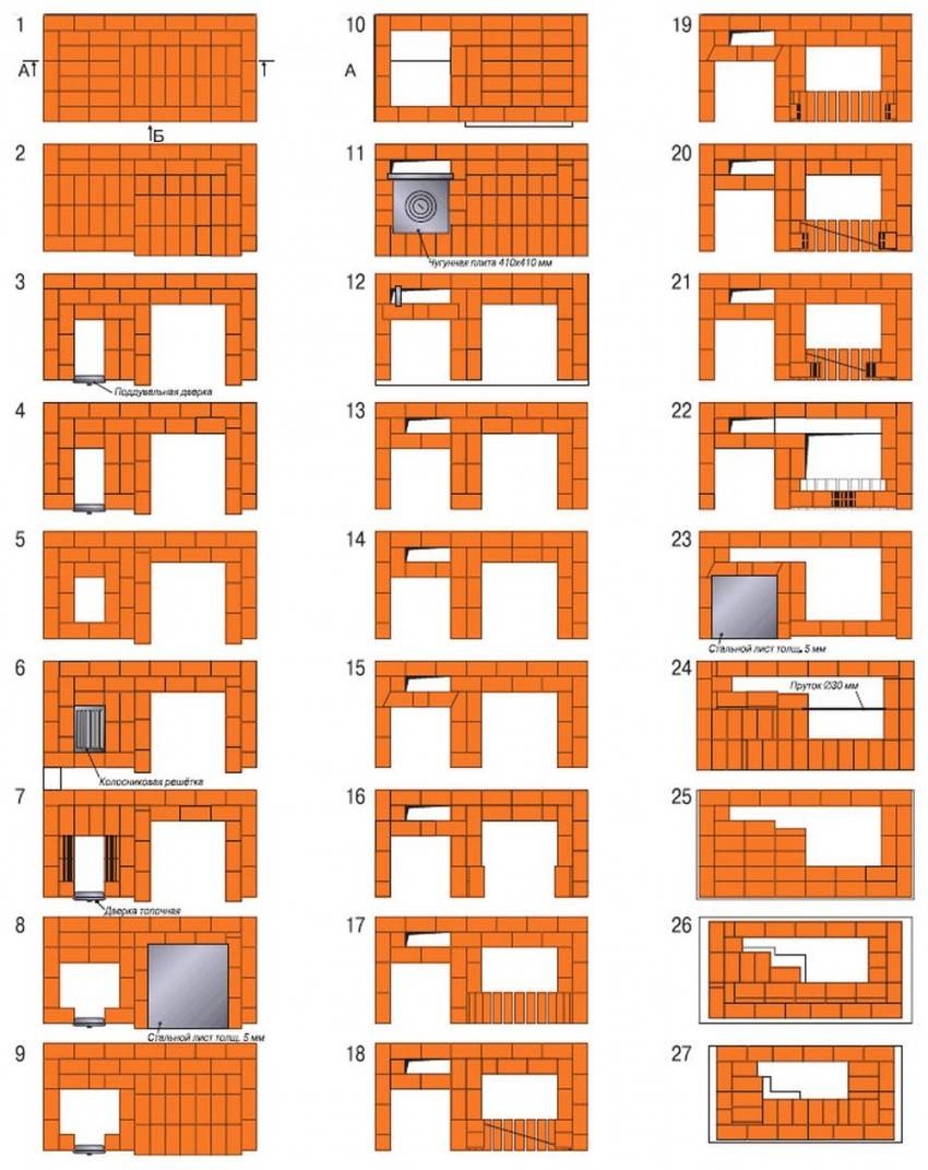 Обратите внимание, что при такой кладке требуются и пиленный кирпич: половинки и трехчетвертные. Трехчетвертные на схеме перечеркнуты крест на крест, половинки — одной диагональной полосой