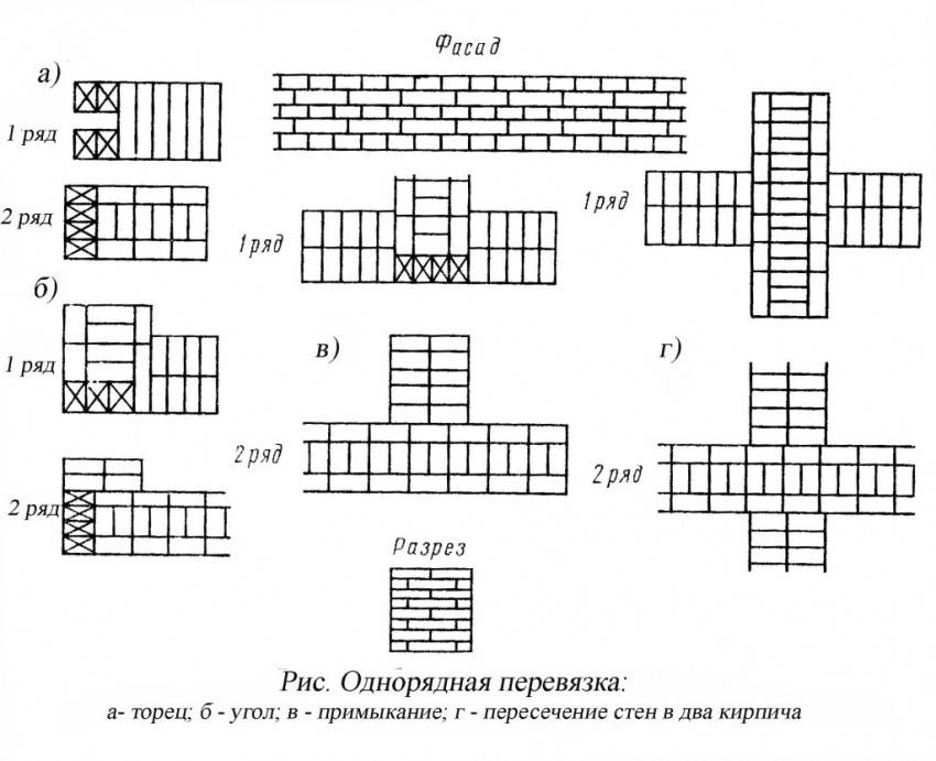 Простой признана однорядная перевязка. При ней чередуют тычковые и ложковые ряды с внешней стороны планируемой основы (если это стена). В этом случае будут необходимы не полноразмерные кирпичики в большом количестве.