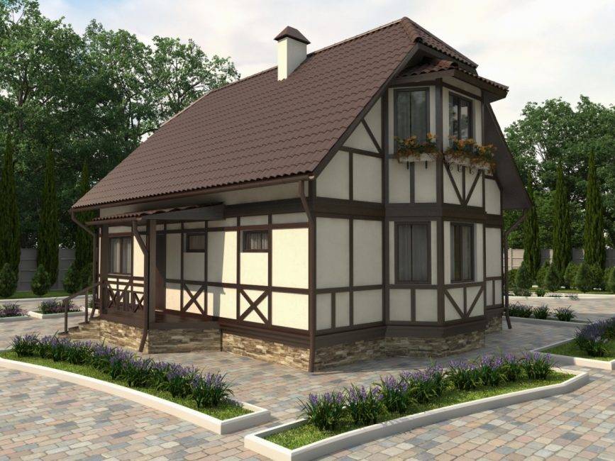 - Фахверк – популярное направление немецкого стиля. Благодаря самой простой отделке, дома в таком стиле выглядят необычно, симметрично и колоритно. Построен дом с помощью деревянных балок, которые соединяются по диагонали и перпендикулярно. Балки визуально разделяют фасады и с помощью этого украшают дом таким своеобразным декором, присвоенным только фахверку.
