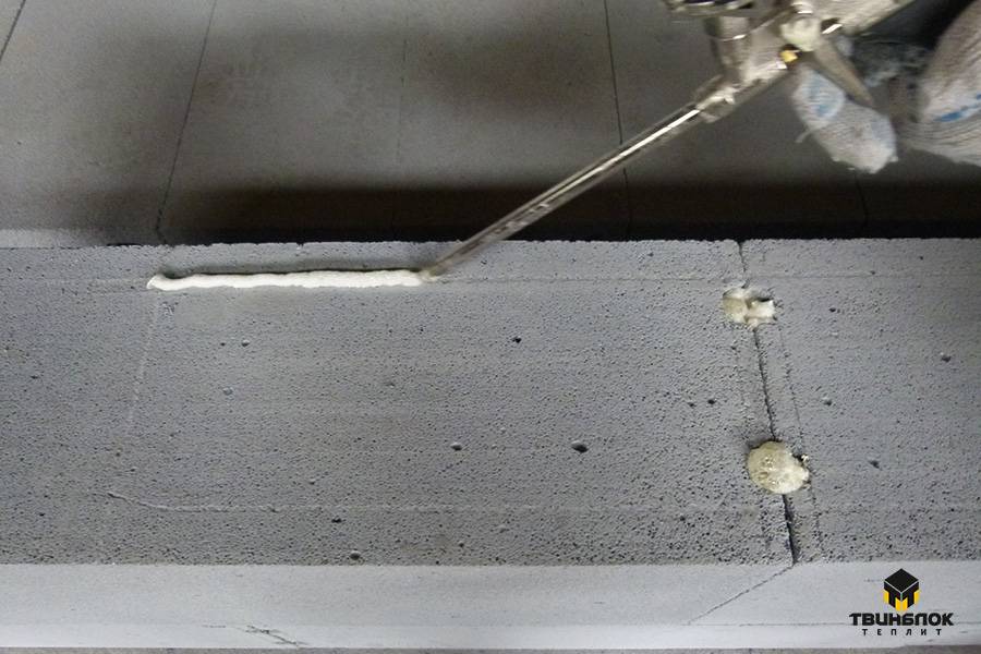 Нанесение клеевой пены проводится за счёт пистолета и больше подходит для блоков из пористого бетона и небольших объёмов монтажа.
