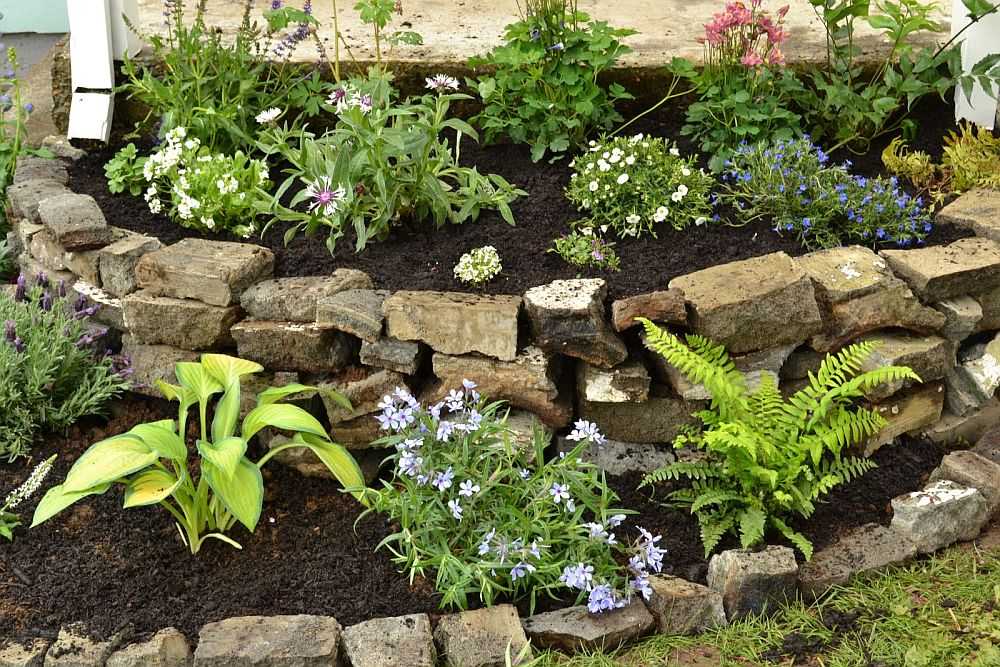 Обломки и половинки кирпича можно использовать для ограждения клумбы своими руками .