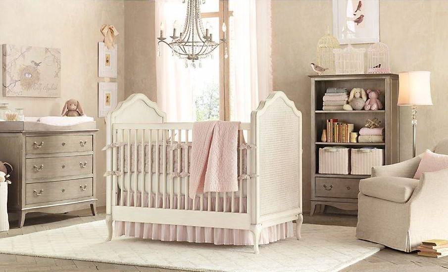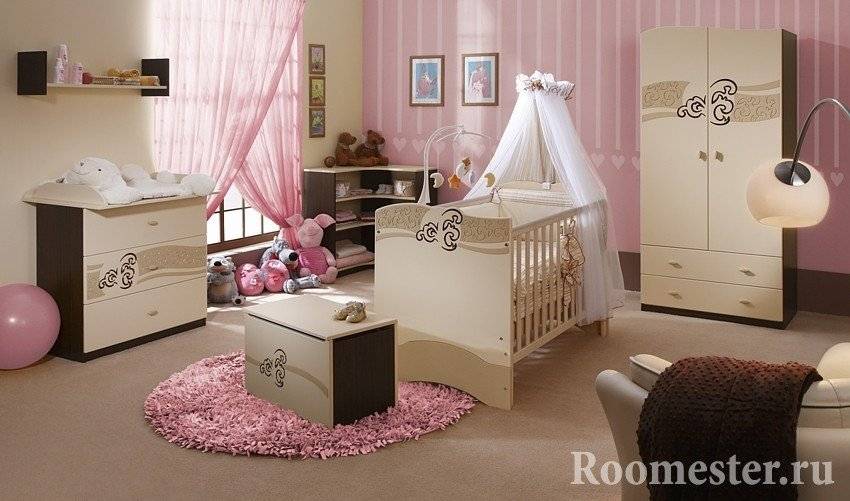 Комната для новорожденной девочки красиво оформляется в нежно-розовых тонах в сочетании с бежевым