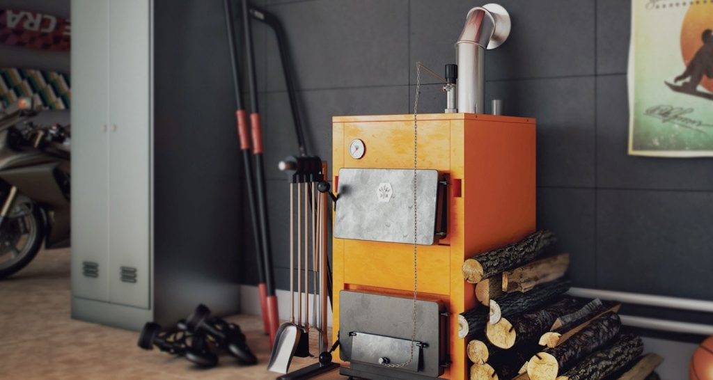 Теплообменником выступает «водяная рубашка», нагревающая теплоноситель. Установка дополнительных заслонок на путях выхода газов повышает теплоотдачу и КПД.