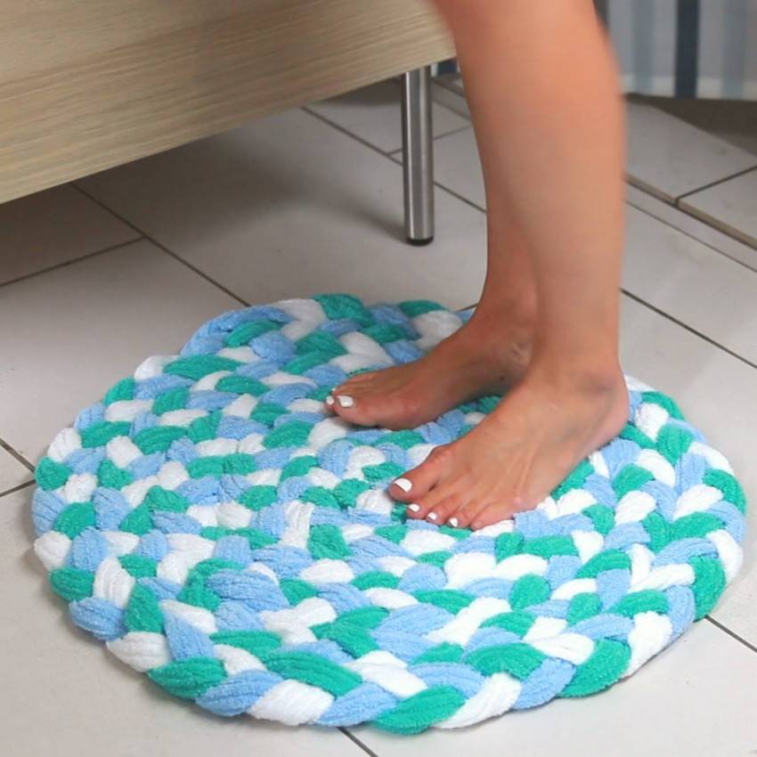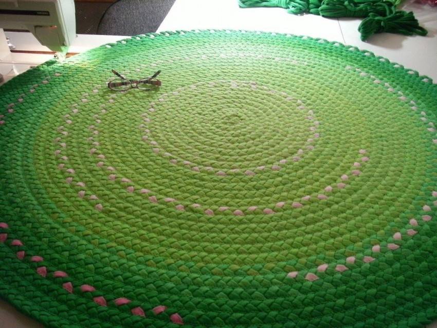 Первый вариант более удобен при укладке плотных и жестких заготовок. А как сшивать коврик из косичек, сплетенных из тонкого материала? Можно аккуратно создавать изделие ряд за рядом, пристрачивая на основу, например, швом зигзаг. Контрастная по цвету строчка будет дополнительным оформлением изделия. В том случае, если у вас нет специального оборудования в виде машинки, можно соединять импровизированные шнурки потайными стежками вручную. Тогда выполнять работу нужно в два этапа, следующих сразу же один за другим: сшивание находящихся рядом косичек и их укладка с закреплением на достаточно плотной тканевой основе.