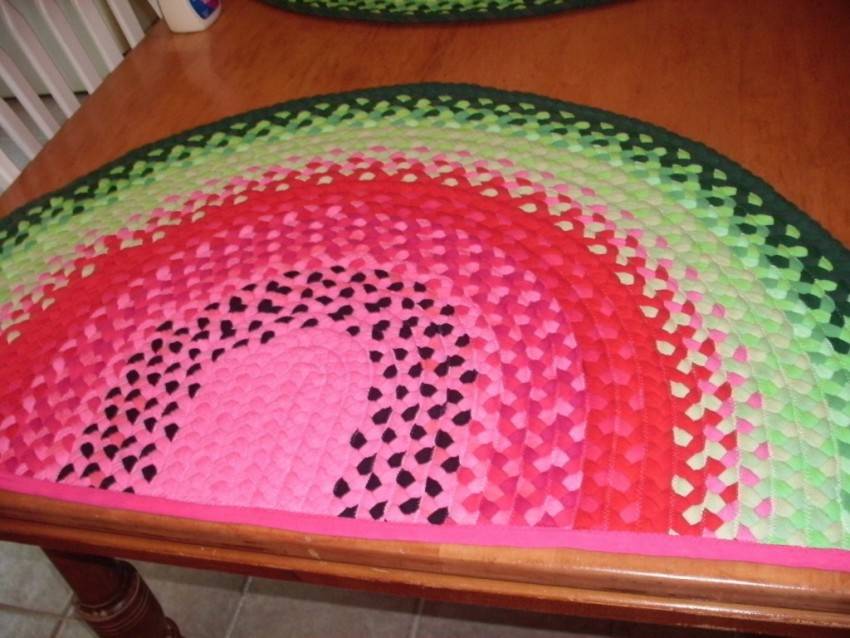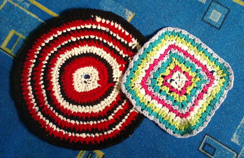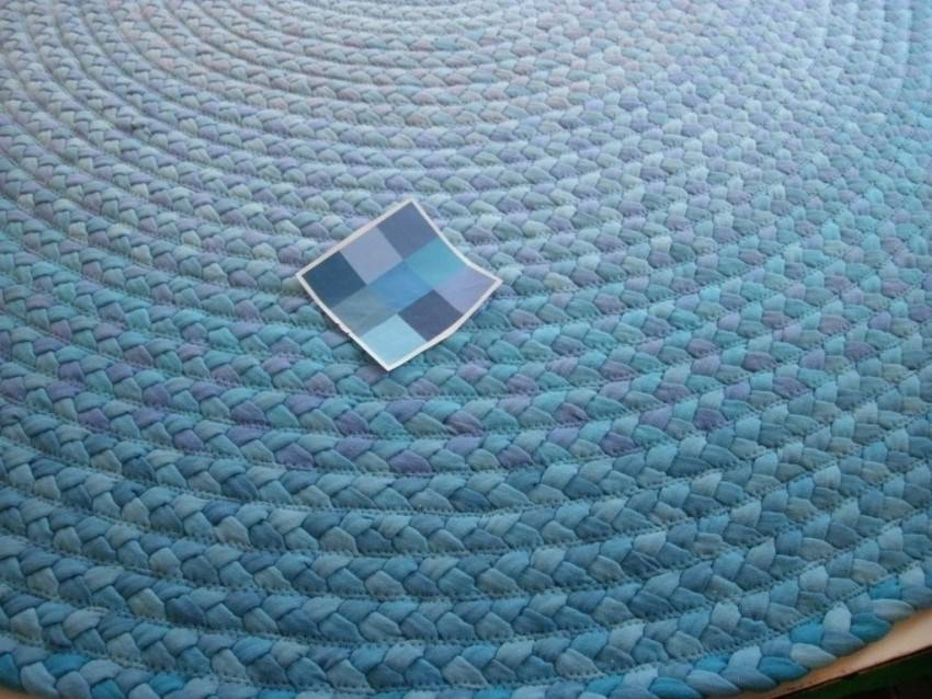 Аналогичный коврик можно сделать и без сетки, вместо нее потребуется плотная ткань-основа. Заготовки из трикотажа выполняются по приведенному выше способу.