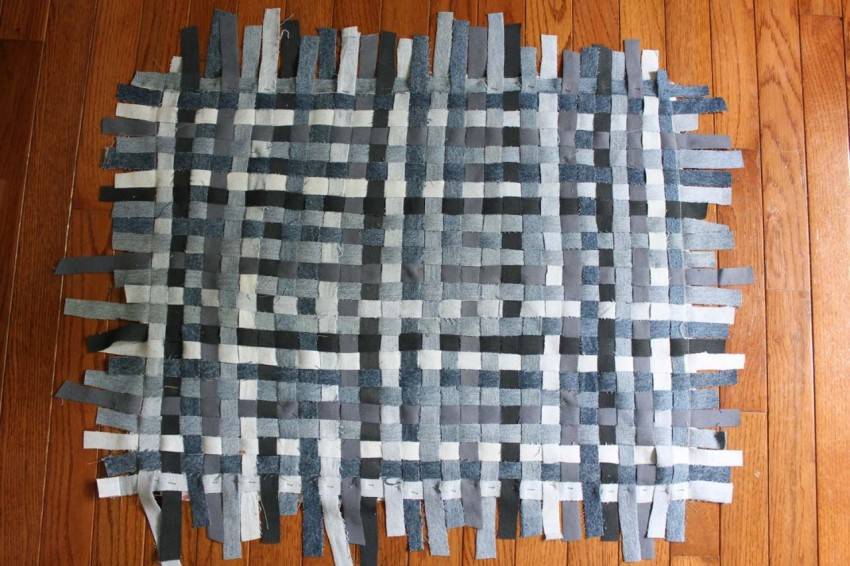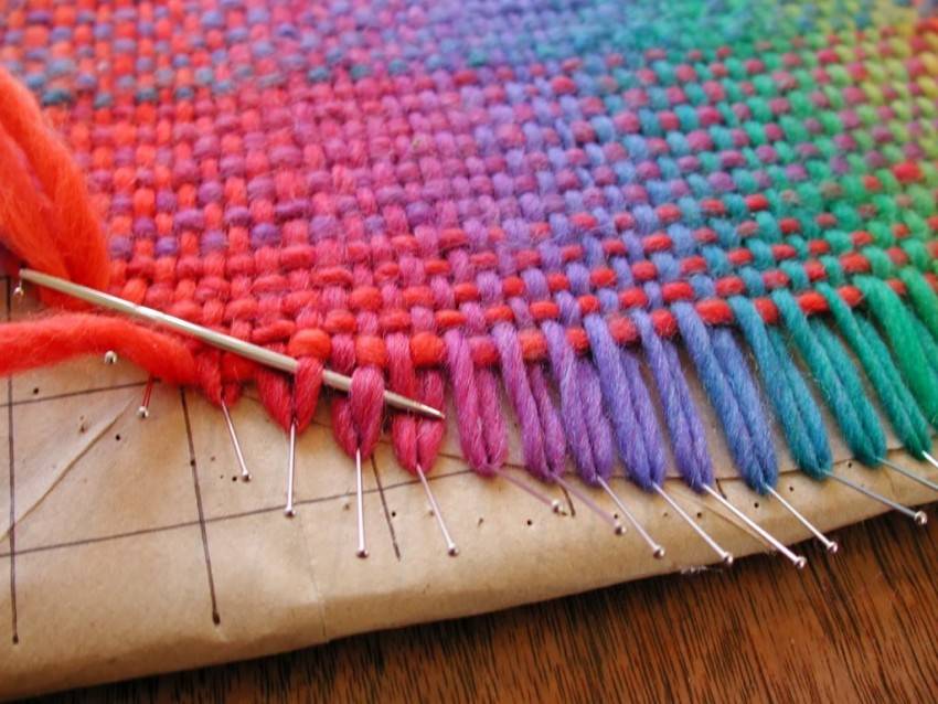 Плетите коврик до необходимой ширины. Чтобы завершить работу, переверните основу и разрежьте нити основы, которые должны быть между разрезами и коврик снимется с картонной основы. Разрезанные концы свяжите между собой двойным узлом.