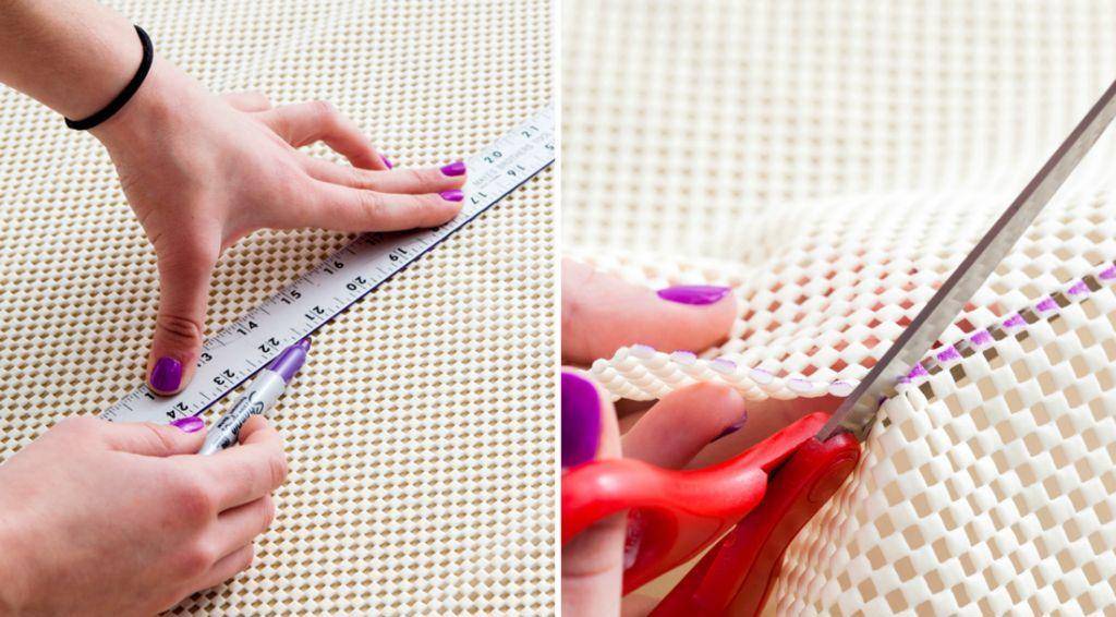 ![]() Шаг 4 | Пока трикотажные заготовки сохнут, подготовьте сетку. Обрежьте ее под размер коврика, придайте основе нужную форму. Если края сетки распускаются, проклейте их с обеих сторон клейкой лентой. |