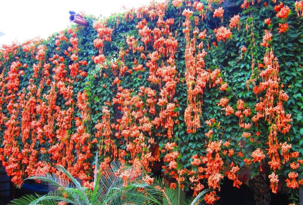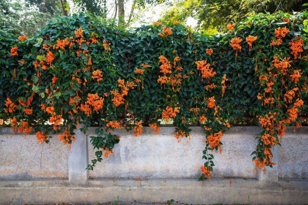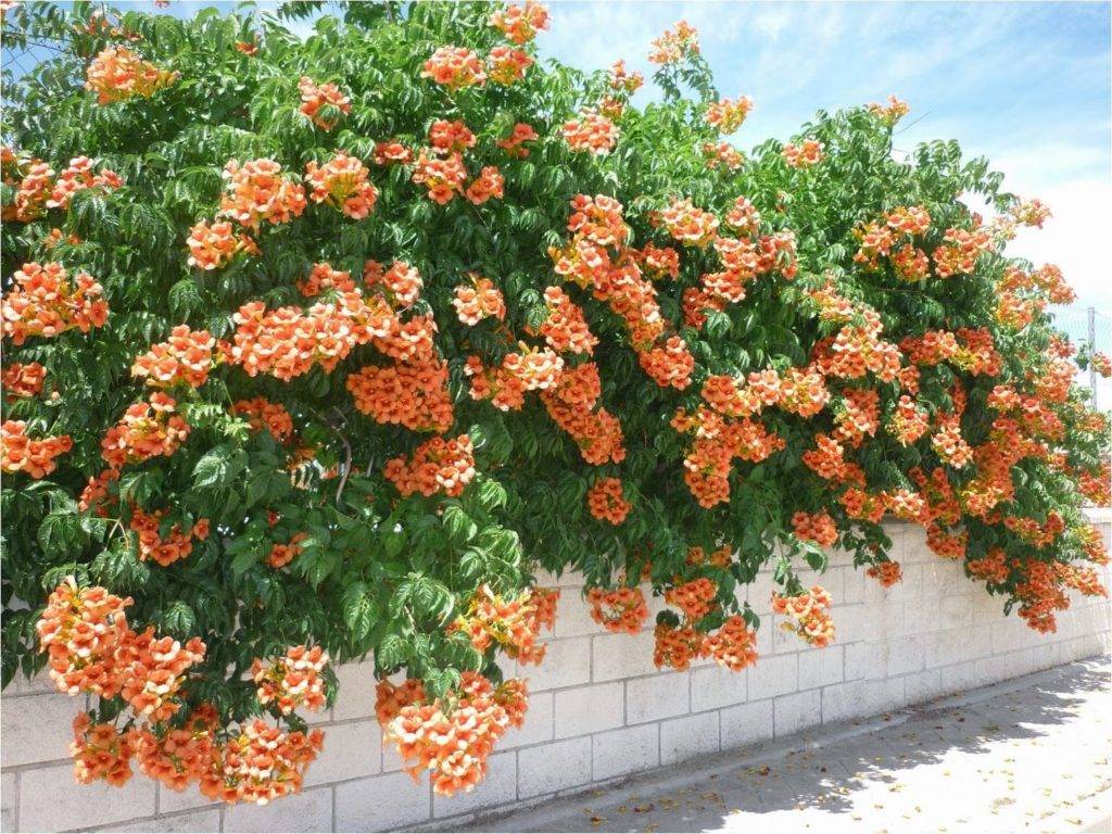 Сделать плотную стенку из живых деревьев удается при посадке в ряд ивы, бука или граба. Для вертикального озеленения подойдут быстрорастущие лианы (жимолость, плющ, хмель, девичий виноград). В южных районах мощные живые стенки можно создать с помощью кампсиса – эта мощная лиана дарит миллиарды эффектных цветов за сезон, но плохо зимует без укрытия в районах с суровым климатом.