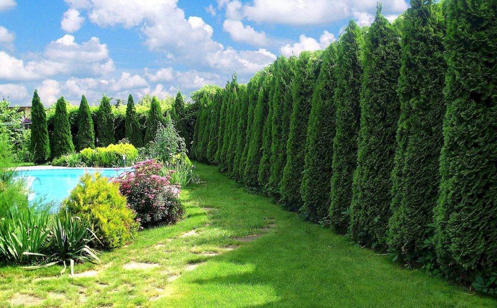 Хвойные растения также популярны в создании живой изгороди. Это туя, кипарисовик Лавсона, разновидности сосен и елей, можжевельник.