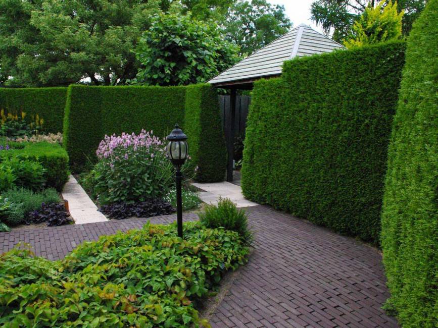 - Стиль ландшафта сада – плотные живые посадки, выполняющие функцию непроходимой стены, должны увязываться с общим стилевым решением в оформлении садового участка.