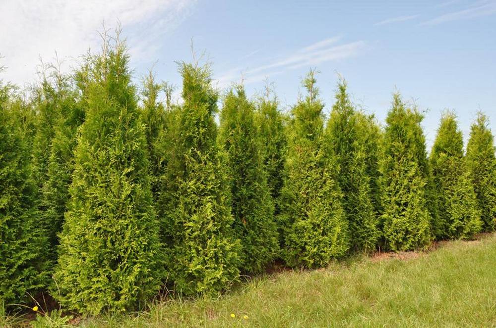 Хвойные растения также популярны в создании живой изгороди. Это туя, кипарисовик Лавсона, разновидности сосен и елей, можжевельник.