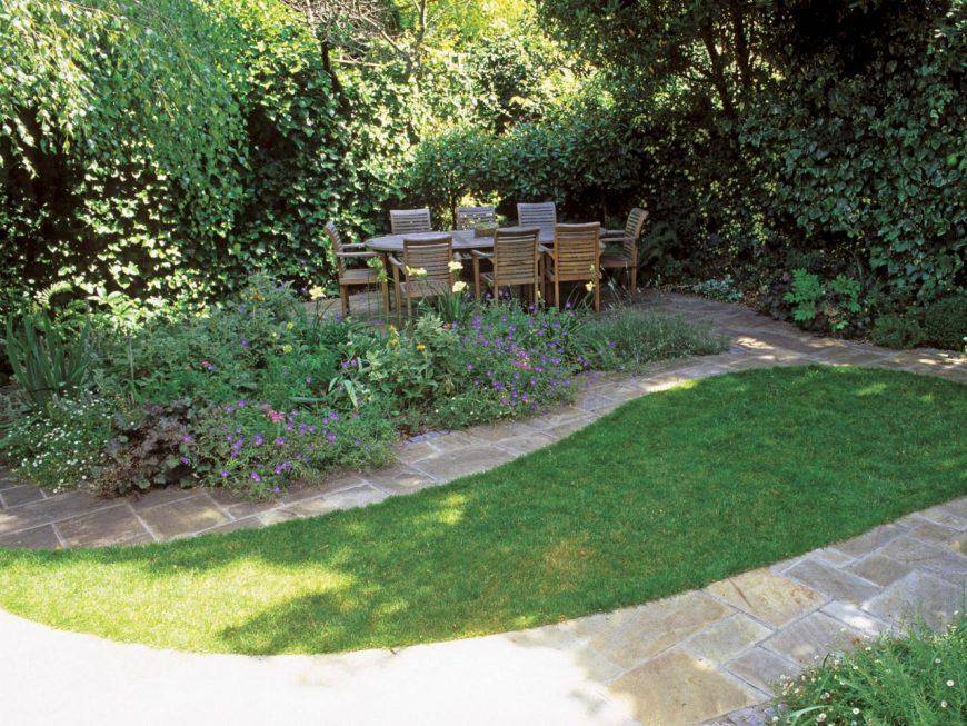 Если на даче уже есть газон, то он станет прекрасным обрамлением для небольшой площадки, где будет собираться вся семья.