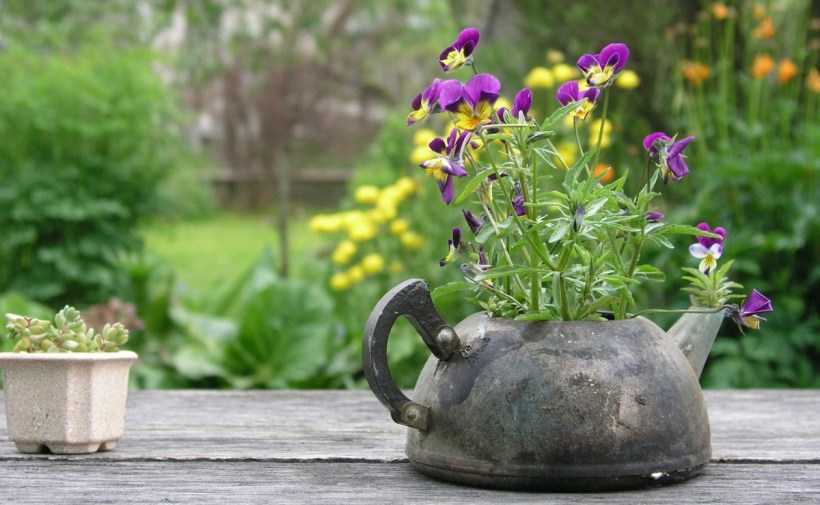 Не выбрасывайте старые чайники. 2-3 чайника, заполненные землей, могут стать отличным вариантом кашпо для посадки цветов. Кашпо можно разместить в беседке, около веранды, в зоне барбекю и так далее.